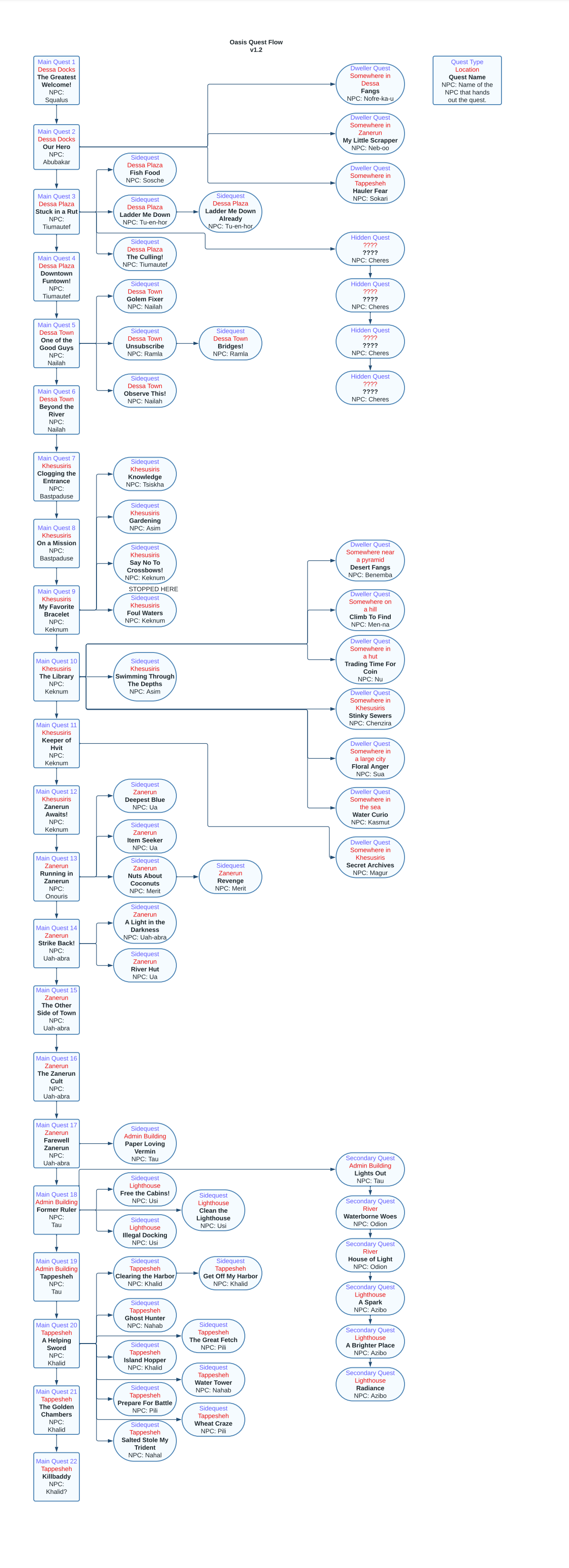 The diagram below illustrates the progression of quests throughout The Oasis adventure:
